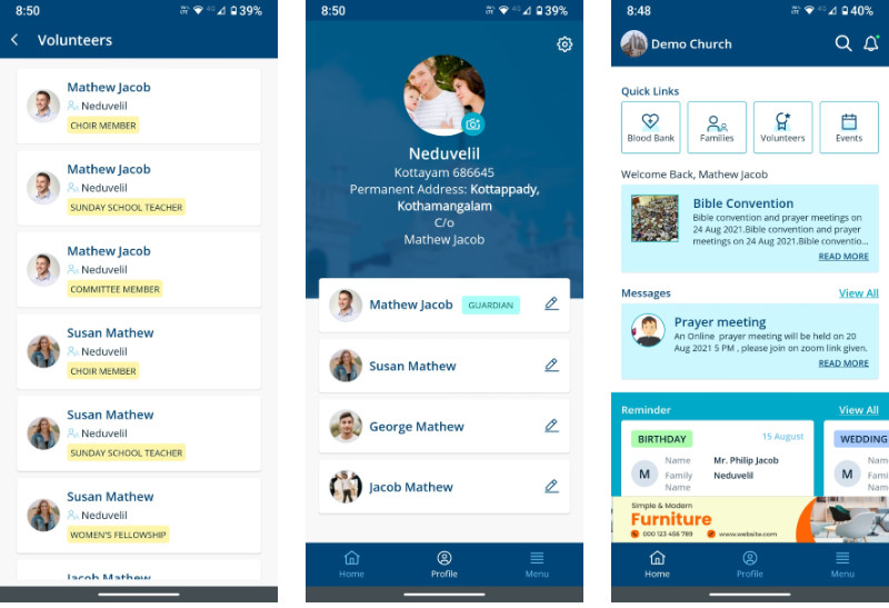 - Newsletters, daily messages, youTube live streaming links, Church committee details can be managed by the Content management system.